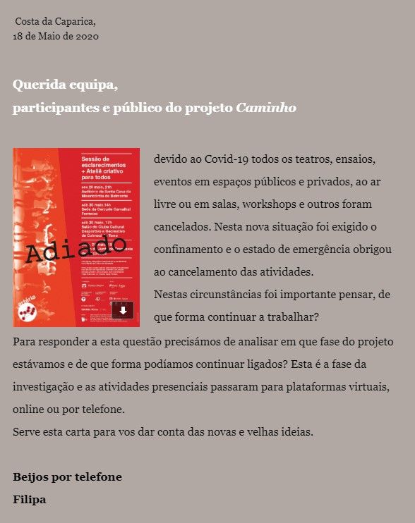 Este CAMINHO trouxe para a sua construção uma pandemia que nos distanciou e abalou a tirania das certezas, decidindo perante isso, não ter, serenamente, soluções. O grupo, em cocriação, construiu um espetáculo de dança com participação comunitária em que o encontro, o toque e o estar em coletivo foram colocados em causa, pelo menos da forma como os conhecíamos até então. Mesmo assim, o CAMINHO fez-se, respirando muito e bem, cruzando corpos em busca das suas origens, propondo a bailarinos e músicos, profissionais e não profissionais das artes, correr os mesmos riscos éticos e estéticos. Convocaram-se instrumentos musicais como extensões dos corpos, a tecnologia da atenção e do detalhe como parte integrante do processo, a mescla de referências, histórias, vozes e visões múltiplas e uma vontade pulsante de criar e, assim, concretizar outros “estar juntos”.