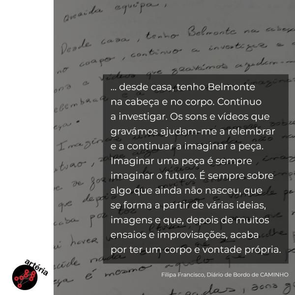 desde casa, tenho Belmonte na cabeça e no corpo. Continuo a investigar. Os sons e vídeos que gravámos ajudam-me a relembrar e a continuar a imaginar a peça.