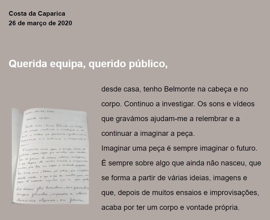 desde casa, tenho Belmonte na cabeça e no corpo. Continuo a investigar. Os sons e vídeos que gravámos ajudam-me a relembrar e a continuar a imaginar a peça.